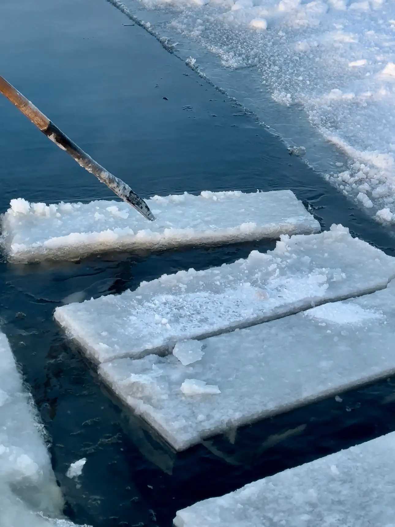 Следует важнейшая стадия — подъем ледяных глыб. Для этого используют сани-рычаг. Один край помещают под блоком, на другой оказывают давление. Так крупный чистый параллелепипед оказывается снаружи. На берегу его сразу же режут на ровные кубы
