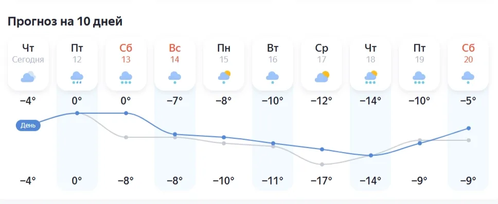 Уже завтра, 12 декабря, температура повысится до 0°С с сегодняшних -6°. Существует высокая вероятность выпадения мокрого снега. К вечеру субботы температура вновь снизится до -8°С. В понедельник, 15 декабря, ожидается -8… -10°С, 16-го – еще на градус ниже, а в среду, 17-го, предсказывается значительное похолодание – до -17°С в ночное время.
