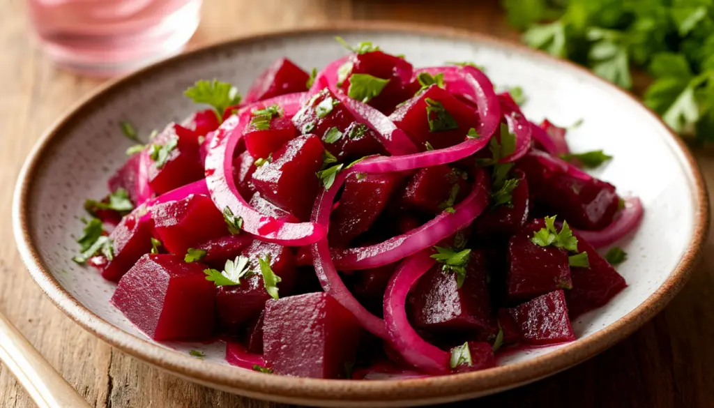Этот яркий салат доказывает, что свёкла может быть не только компонентом винегрета, а самостоятельным, пикантным блюдом.