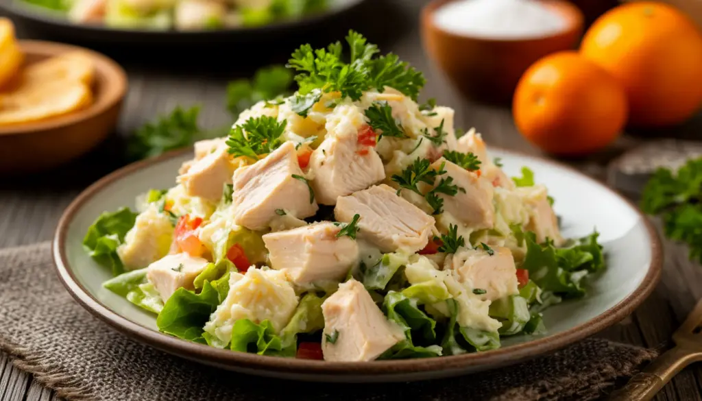 - Польза: Сочетание нежирного белка курицы и ферментов ананаса, способствующих пищеварению, делает салат хорошим выбором для праздничного меню. Как отмечает нутрициолог Ирина Белова: «Белый цвет символизирует очищение, а соединение мяса с фруктом — энергию обновления. Такой салат идеально ложится в концепцию новогоднего стола — легкий, но с ярким характером».