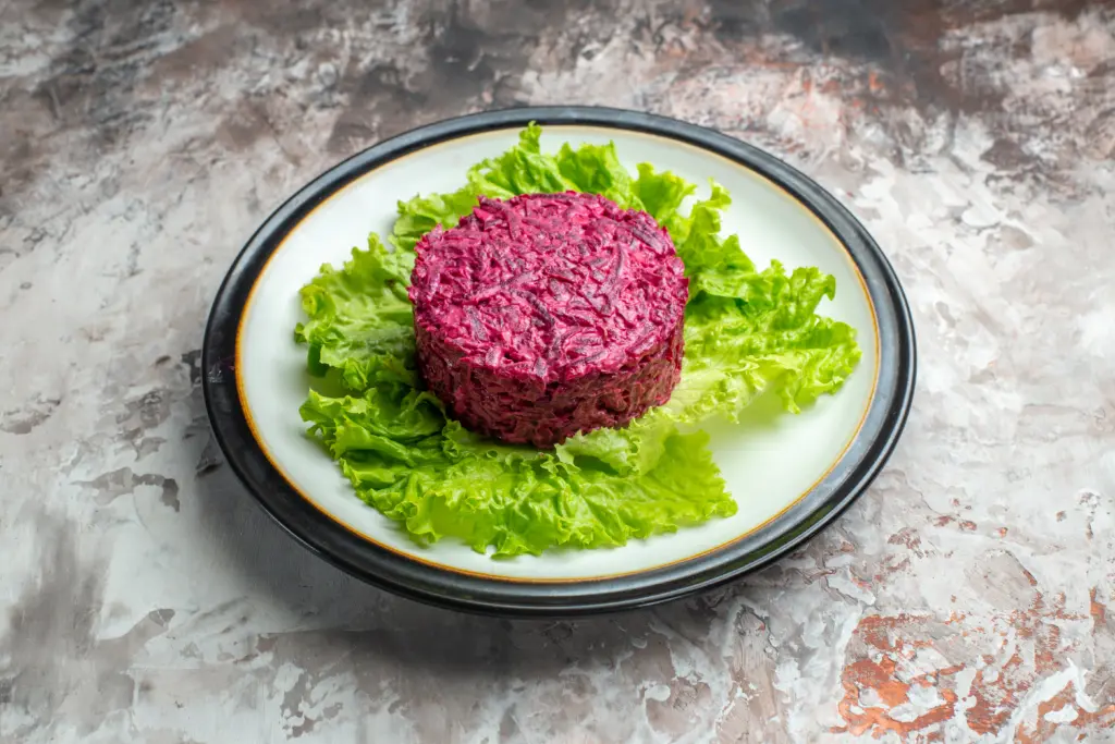 - Финишный слой: Натертая на средней терке свекла и завершающая майонезная сеточка.