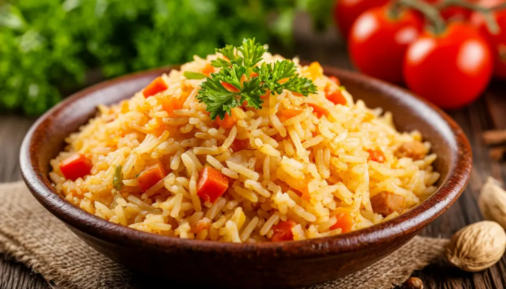 Цельная головка чеснока под воздействием пара постепенно раскрывает свой аромат, обогащая рис и мясо, но не доминируя над ними. К концу приготовления зубчики становятся мягкими и кремовыми, их можно размять и подать как дополнение к блюду.