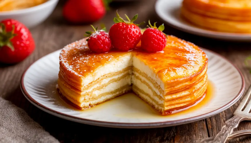 Лёгкий блинный торт с воздушным творожным кремом по вкусу напоминает мороженое и станет отличным завершением любой трапезы.