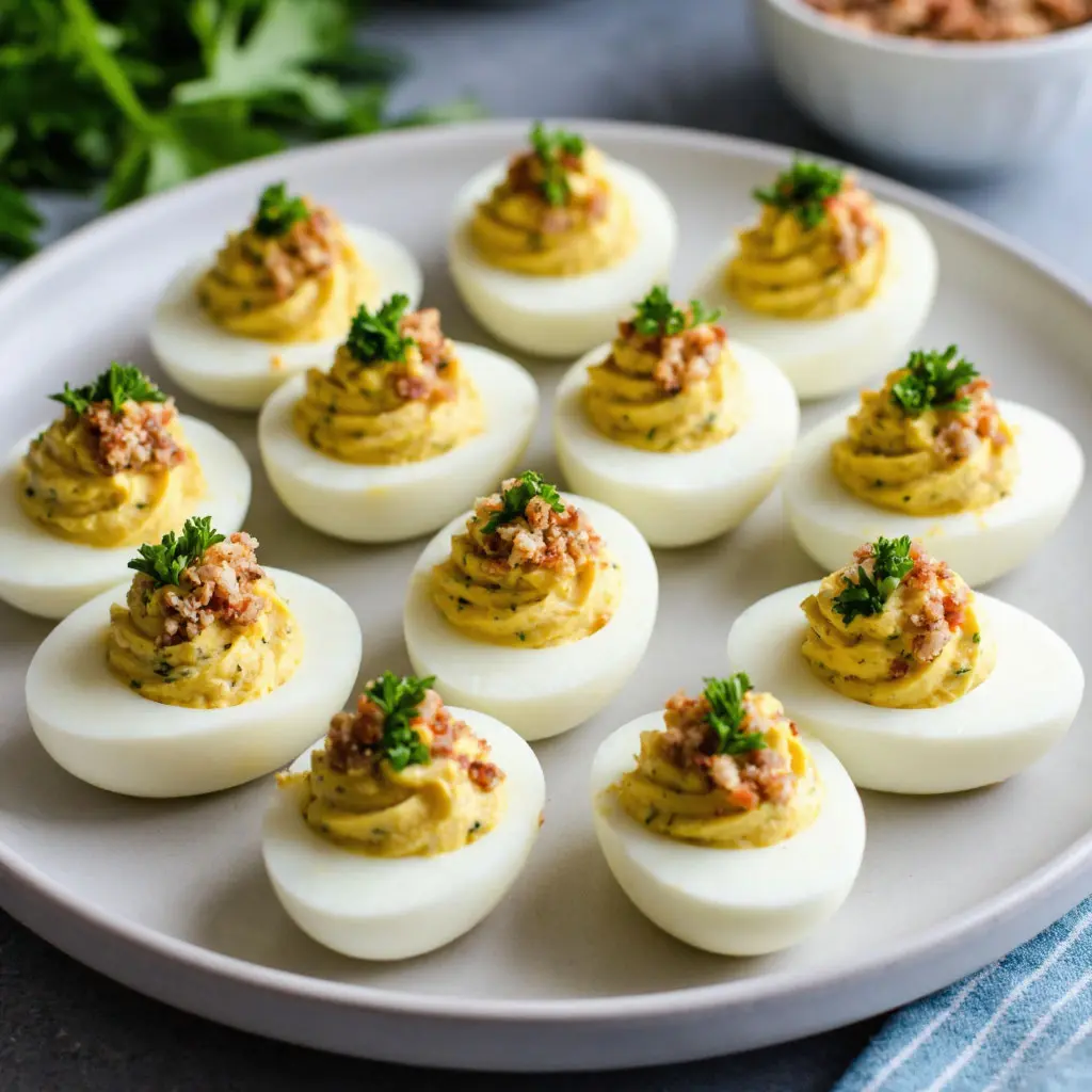 - Наполните половинки яичных белков получившейся начинкой, сформировав аккуратную горку.