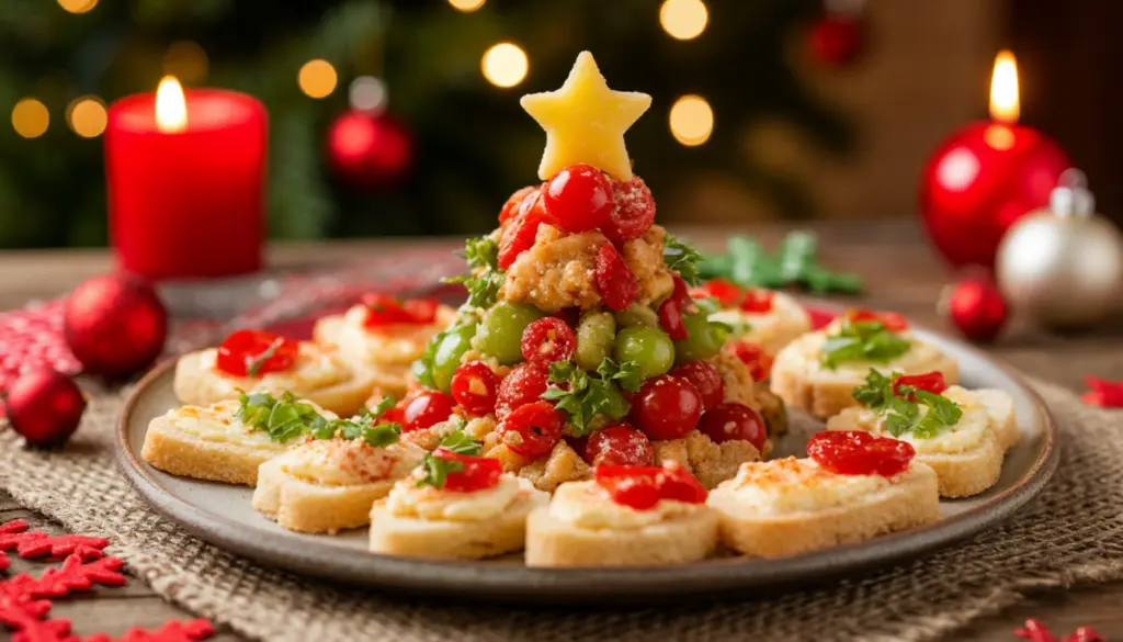 - На большое плоское блюдо или сервировочную доску выложите шарики, формируя контур ёлки: внизу — больше шариков, кверху — меньше. Чередуйте шарики двух видов для контраста.
