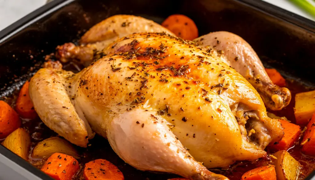 Достаньте курицу, накройте фольгой и дайте ей «отдохнуть» 10–15 минут. Это не прихоть, а необходимость: соки равномерно распределятся по всему мясу, и при нарезке они останутся внутри, а не на доске.