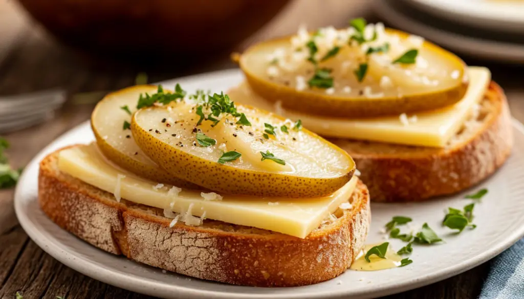 Подавайте немедленно, пока хлеб хрустит, сыр тает, а груши источают тепло и аромат. Идеальная пара — бокал не слишком сладкого игристого вина или лёгкого красного, например, пино нуара. Наслаждайтесь моментом!