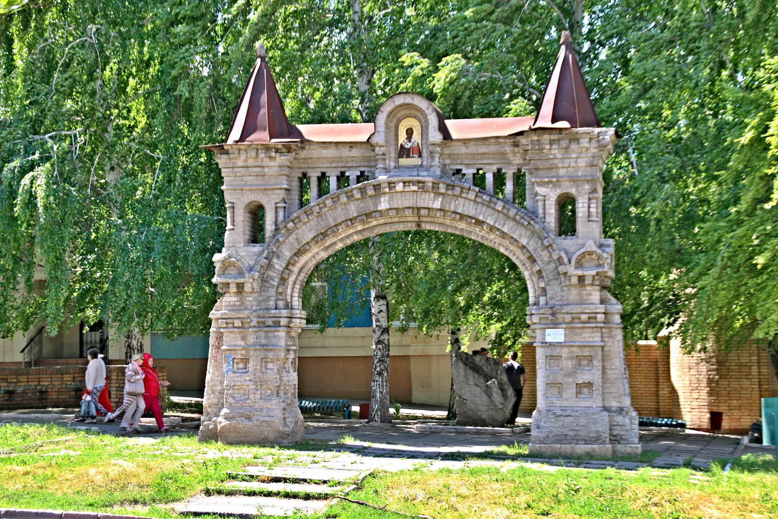 Это единственное, что сохранилось от Никольского мужского монастыря, основанного в XIX веке. Каменные ворота, возведенные в 1863 году, признаны объектом культурного наследия. Ранее они служили входом на обширную территорию монастыря, а впоследствии стали символом целых районов — поселков Новый Афон и Монастырский, которые сейчас входят в состав города.