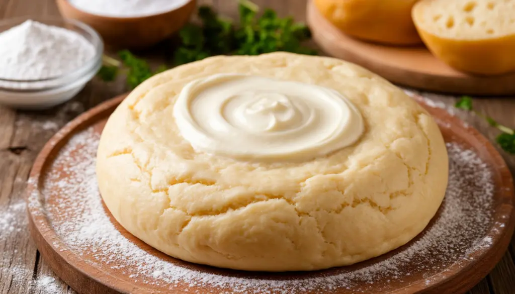 Постепенно, небольшими порциями, начинайте вводить просеянную муку. Сначала размешивайте ложкой, а когда масса загустеет — переходите на ручной замес. Тесто должно получиться мягким, эластичным и слегка липнущим к рукам — это нормально. Не стремитесь вмешать всю муку «до последней крошки»; если останется 20-30 граммов, ничего страшного. Главное — не перемучить тесто, иначе оно станет тугим. Общее время замеса — не более 2-3 минут.