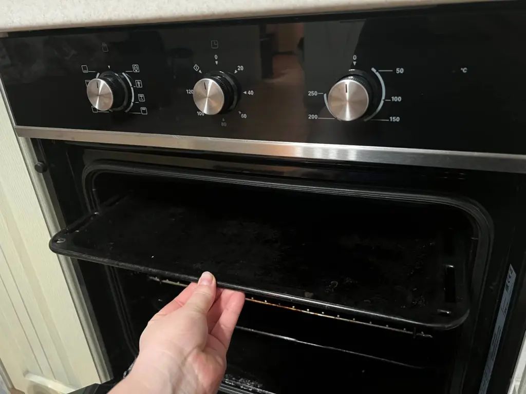 - Подготовка. Сразу после готовки, пока духовка ещё тёплая, достаньте из неё все решётки и противни. Их вымоете отдельно.