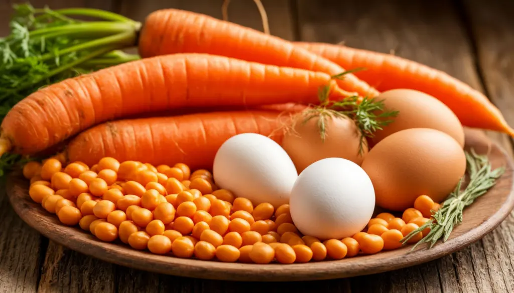 - Сварите базу. Положите морковь и яйца в кастрюлю с холодной водой, доведите до кипения. Яйца варите 10 минут после закипания, морковь — 20-25 минут до мягкости. Сразу залейте холодной водой — так они лучше чистятся.